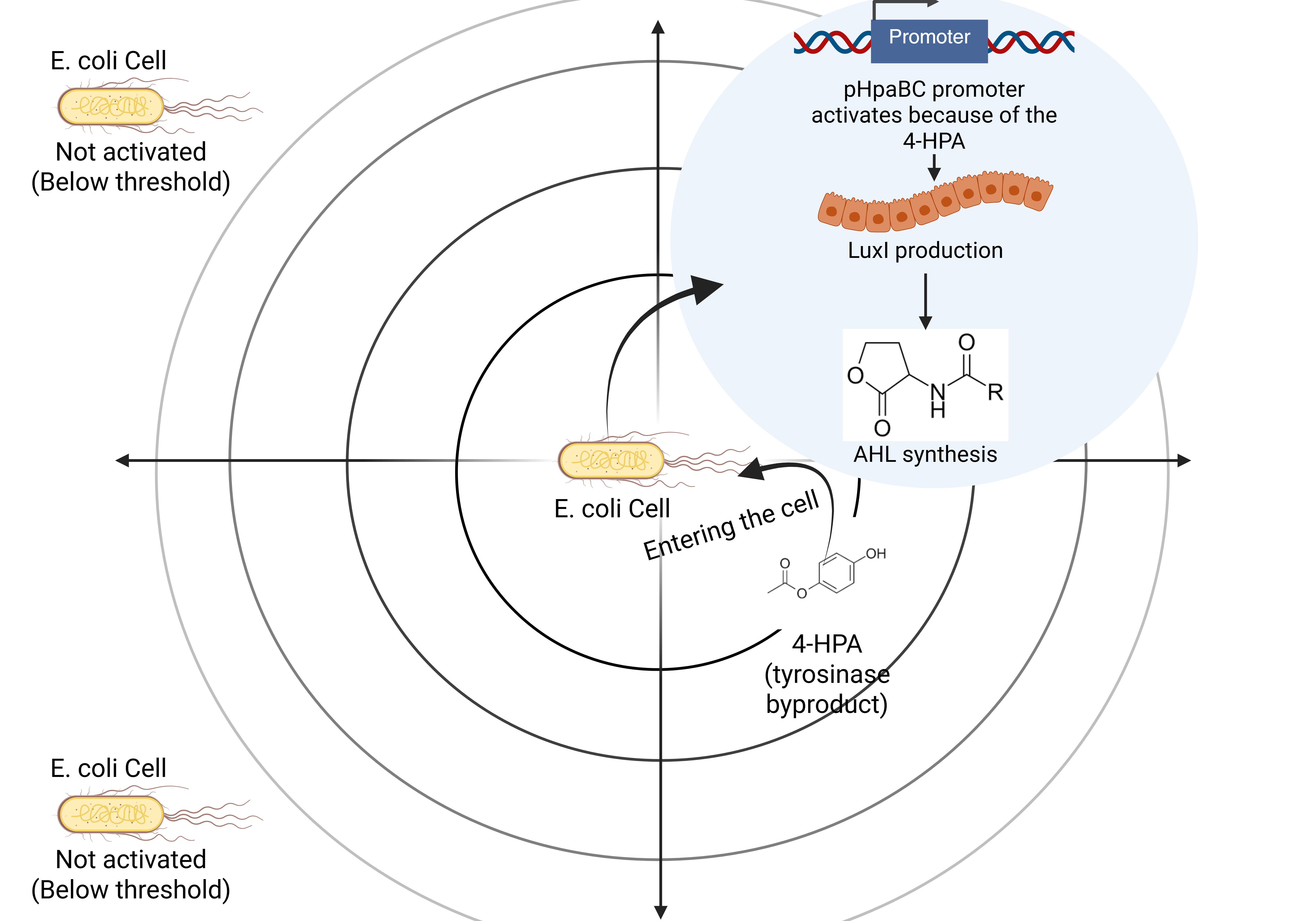 Once activated, the sensing promoter drives transcription of a genetic amplifier system, making the system stronger. The core component here is a positive feedback loop using the LuxR & LuxI quorum sensing system. When one bacterium detects 4-HPA and activates the promoter, it also makes a molecule called AHL.(Saric-Bosanac et al., 2020). This molecule spreads to nearby E. coli and tells them to turn on too, even if they did not detect the 4-HPA themselves. This way, the whole area changes color, not just one or two cells. This loop activation increases the strength and persistence of the output signal, even with weak tyrosinase signaling. However, the spread of AHL is limited to a short range and only activates cells within the local area where the 4-HPA is, after the foam is removed or the AHL naturally diffuses away, the signal activation stops, preventing uncontrolled spread across the skin.