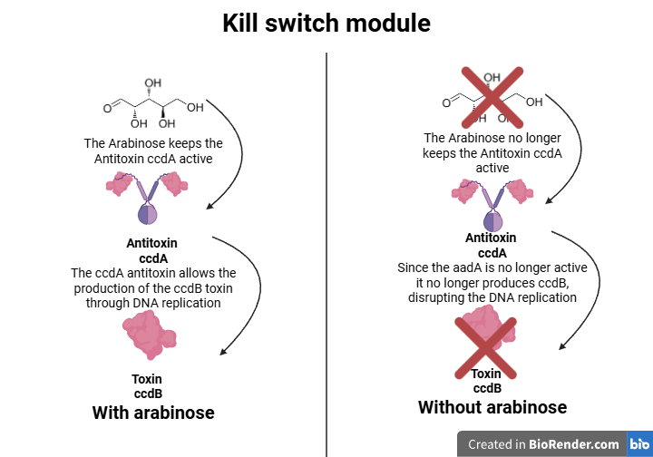 The kill switch uses a toxin-antitoxin system (ccdB/ccdA) to make sure the bacteria do not survive after use (Figure 3). During use, the foam contains an inducer (arabinose) that keeps the ccdA antitoxin gene active, allowing the bacteria to survive even while producing the ccdB toxin. Once the foam is washed off, the inducer is removed, and ccdA production stops. Without the antitoxin, the ccdB toxin disrupts DNA replication, killing the bacteria within hours. This prevents environmental contamination or long-term colonization of the skin (Fraikin et al., 2020).