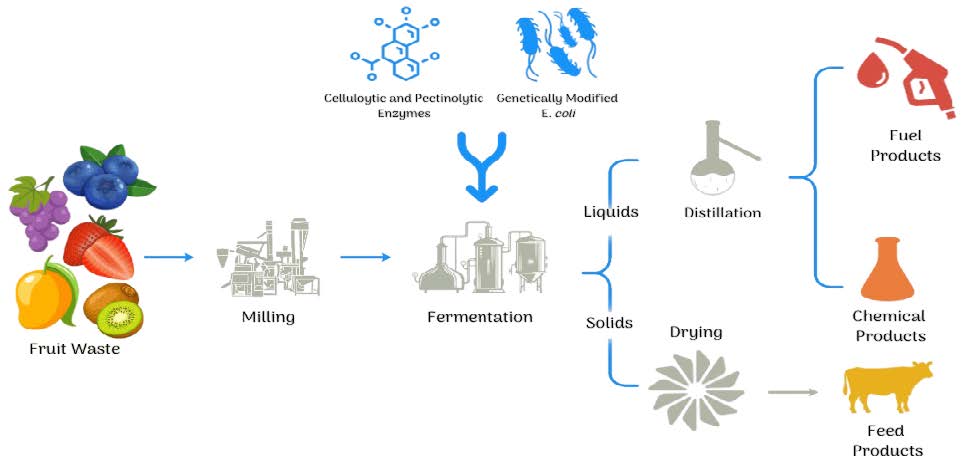 Designed to address greenhouse gas emissions and food waste, our project turns fruit waste into a clean-burning biofuel by converting fruit biomass into ethanol using genetically engineered Escherichia coli. It involves the enzymatic treatment of fruit waste, anaerobic microbial fermentation, the recovery of ethanol, and biomass recycling (Saratale, 2018; Singh, 2017). Fruit waste is rich in complex carbohydrates such as cellulose and pectin, which turn into fermentable sugars, such as glucose, with the aid of cellulolytic and pectinolytic enzymes (Kaur, 2020). Engineered E. coli utilizes those sugars and produces ethanol through an adjusted glycolytic pathway with pyruvate decarboxylase (pdc) and alcohol dehydrogenase (adhB), genes sourced from the bacterium Zymomonas mobilis (Ingram, 1987; Gunasekaran and Raj, 2001). The resulting ethanol is recovered, and the residual biomass can be recycled as feed for livestock (Bhatia, 2022).