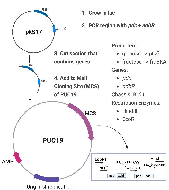 Our microbial system utilizes a dual-promoter synthetic plasmid design to promote bioethanol yield (Green & Sambrook, 2012). To start, plasmid pKS17, which consists of both pdc and adhB genes, is used to amplify both genes into a single gene fragment (Figure 3). Following PCR amplification, the gene fragment containing both pdc and adhB genes is cut with the restriction enzymes EcoRI and HindIII and cloned into the plasmid pUC19 MCS.