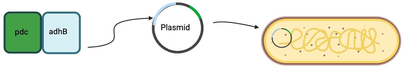 | Figure 4. This figure represents the process of extracting the pdc and adhB genes, using our two-plasmid and two-promoter method, and inserting the plasmid into our chassis. |