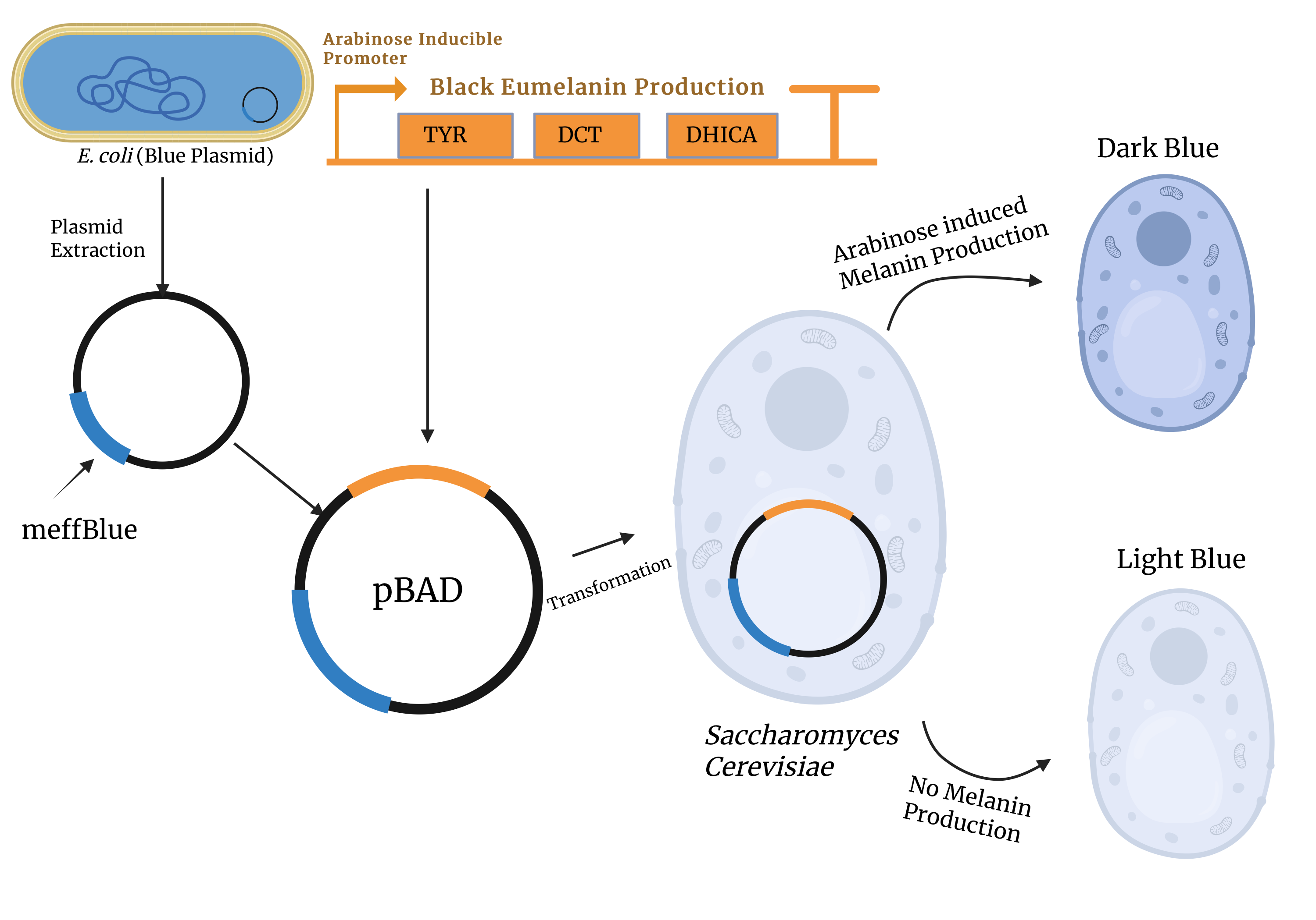Figure 4. Color production process from E. coli to Arabinose-induced melanin production inside yeast.