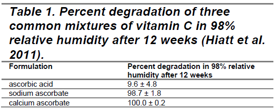 Hiatt, A. N., Ferruzzi, M. G., Taylor, L. S., & Mauer, L. J. (2011). Deliquescence behavior and chemical stability of vitamin C forms (ascorbic acid, sodium ascorbate, and calcium ascorbate) and blends. International Journal of Food Properties, 14(6), 1330–1348. https://doi.org/10.1080/10942911003650338