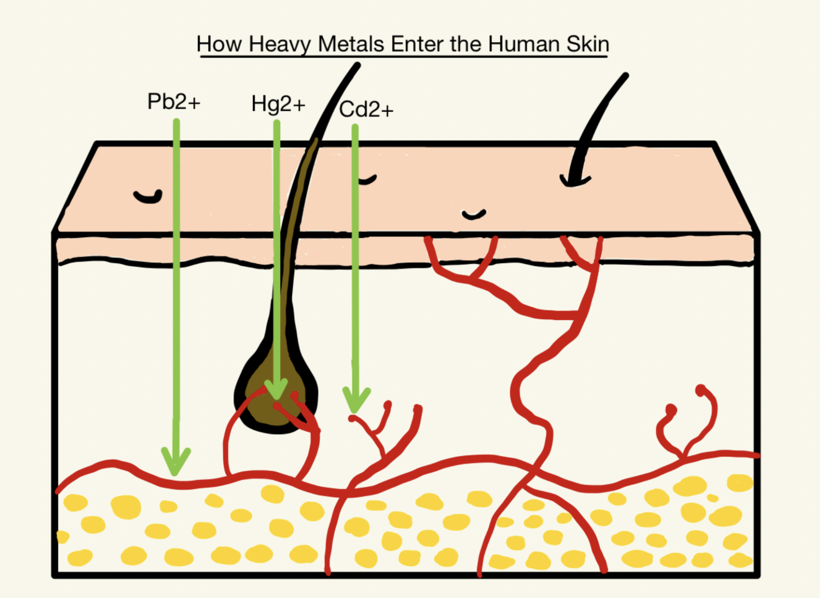 Common substances involved in cosmetics are mercury (Hg), lead (Pb), and cadmium (Cd), and even with strict controls of the manufacturing process and good practices, it is not possible to remove all such compounds or to ensure they are safe to use (Kicińska & Kowalczyk, 2025). Cosmetics are normally composed of small molecules, oil-soluble ingredients, and other chemicals that have similar properties to the skin. Since cosmetics are directly applied to the skin, heavy metals can enter the body through hair follicles and sweat pores, ultimately reaching the blood capillaries (Nnaji et al., 2015; Raza-Naqvi et al., 2022), as illustrated in Figure 1.