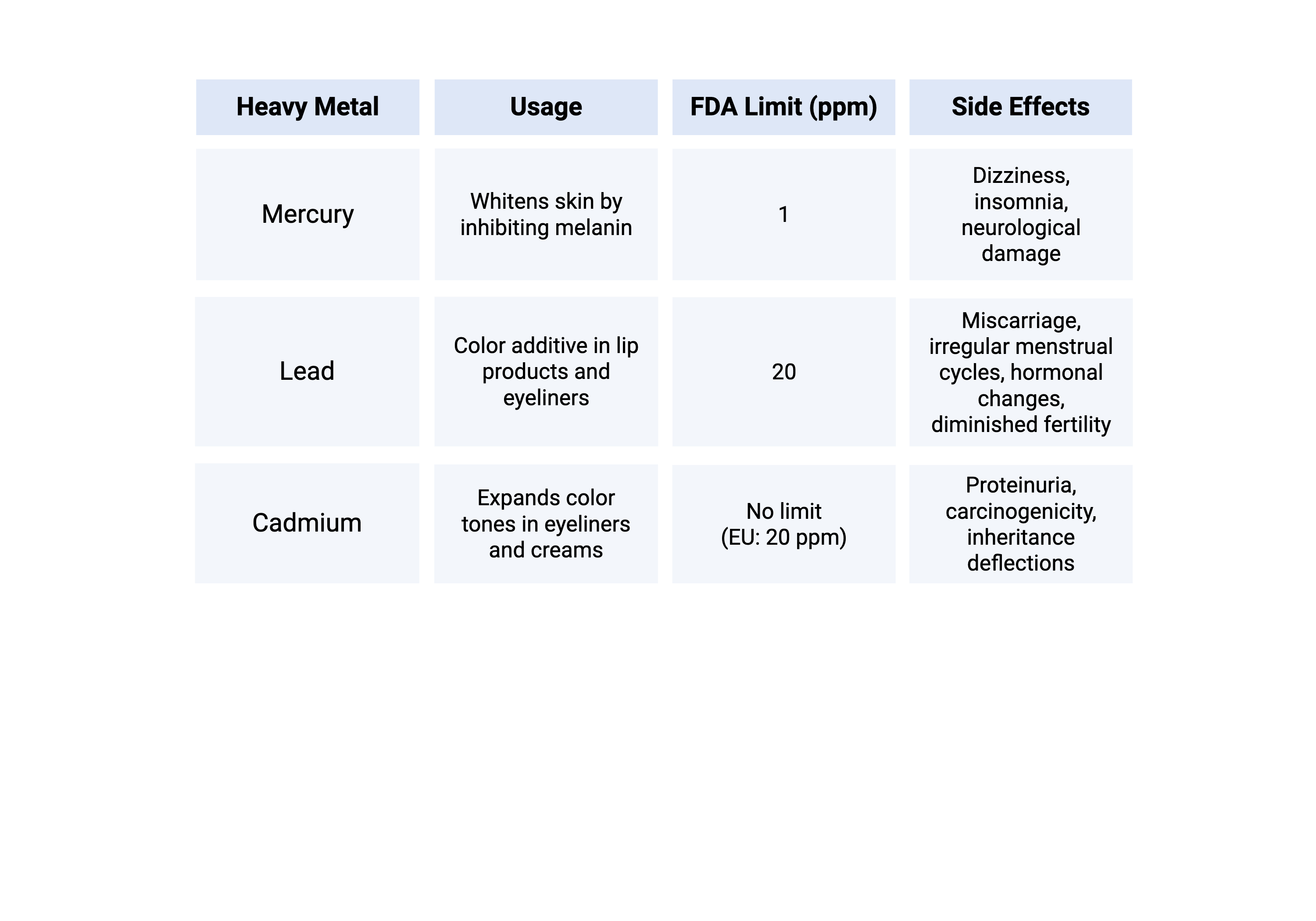 According to the Food and Drug Administration (FDA), mercury is permitted in cosmetics only as a preservative in eye products and must be present at a concentration of less than 1 ppm (FDA., 2020). It is not allowed in other cosmetic products or color additives. The FDA sets a limit of 10 ppm for lead in cosmetics and 20 ppm for lead in color additives. While there are no strict federal regulations in the U.S. regarding cadmium in cosmetics, Health Canada sets a limit of 3 ppm, above which it is considered an impurity (Canada, 2012). Any concentration of these heavy metals exceeding the specified limits is considered contamination and poses a risk to human health.