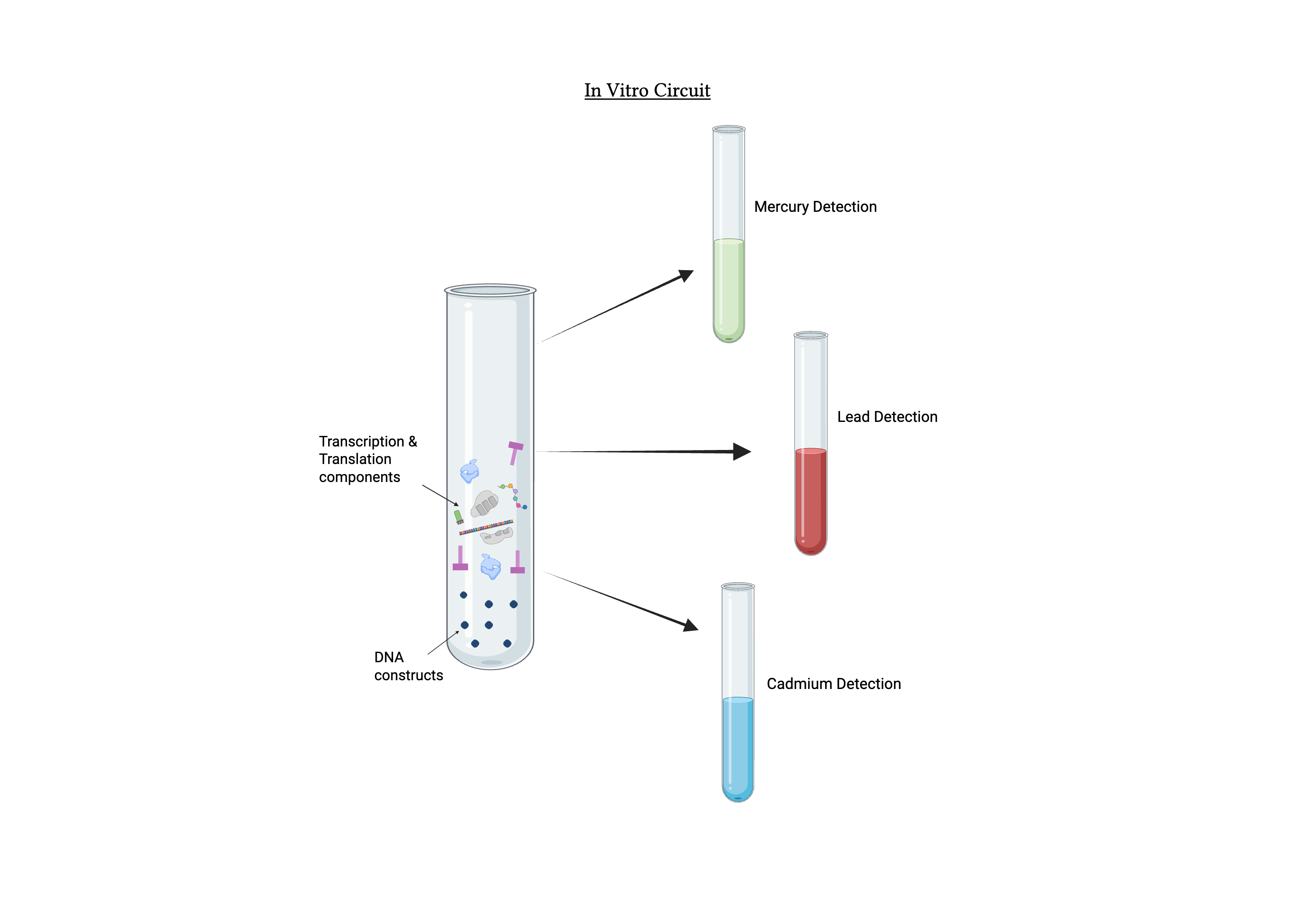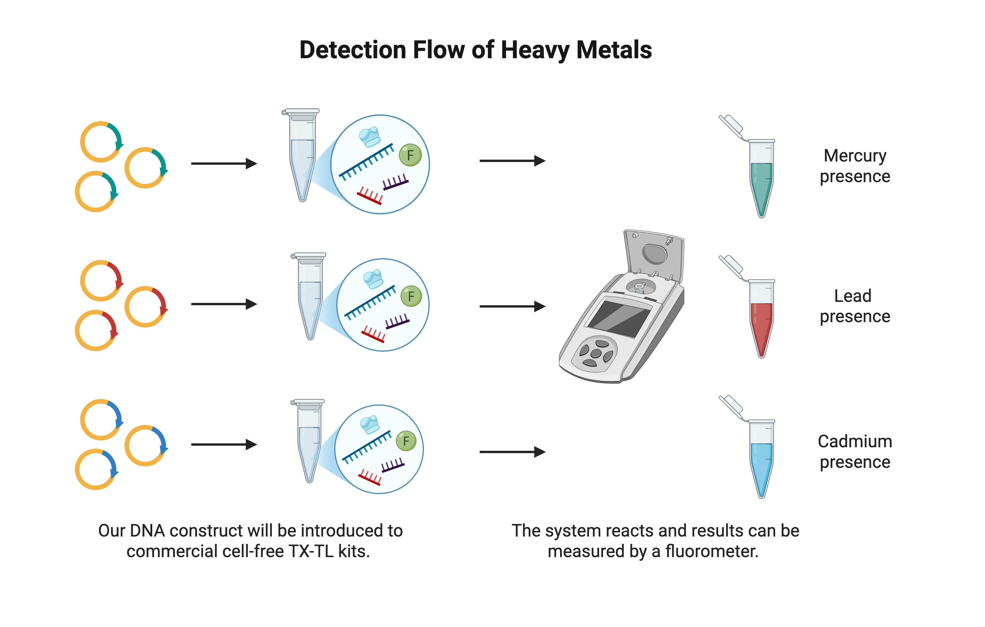 This project aims to engineer an in vitro, lyophilized biosensor to detect contamination by heavy metal mercury, lead, and cadmium in industrial products that pose health and environmental risks. The biosensor, upon rehydration, contains genetic circuits that specifically bind each target metal ion and produces a visible fluorescent signal indicating such presence.
