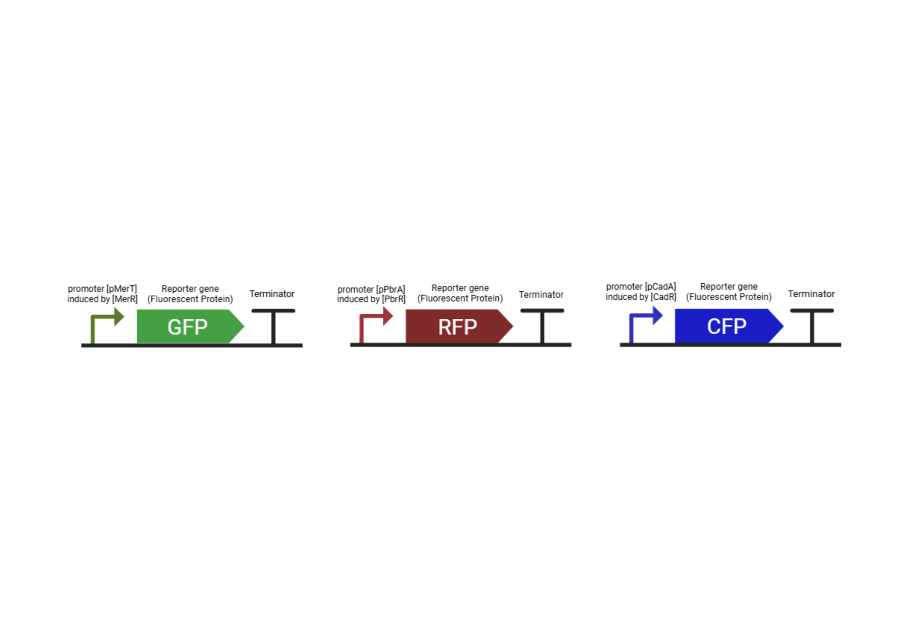 Each metal triggers a distinct color change for easy identification. MerR, a mercury-binding transcriptional regulator, is activated in the presence of Hg ions and initiates transcription of promoter pMerT down the gene, coding for Green Fluorescent Protein (GFP). Similarly, the lead-responsive transcription factor PbrR activates the pPbrA promoter in the presence of lead ions, then initiates the code for Red Fluorescent Protein (RFP) that indicates the presence of lead. Finally, the cadmium-binding transcription factor CadR activates the promoter pCadA and codes for Cyan Fluorescent Protein (CFP) to indicate cadmium ions.