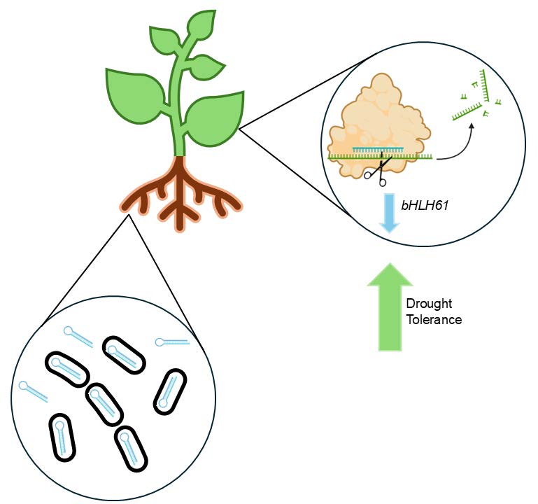 Our project proposes to knock down the expression of bHLH61 in canola using bacteria-mediated RNAi (Figure 1). Our engineered bacteria will be incorporated into the canola seed coating, then incorporated into the plant’s rhizosphere, where they will produce double-stranded hairpin RNA that targets the bHLH61 gene in canola, thus increasing drought tolerance.