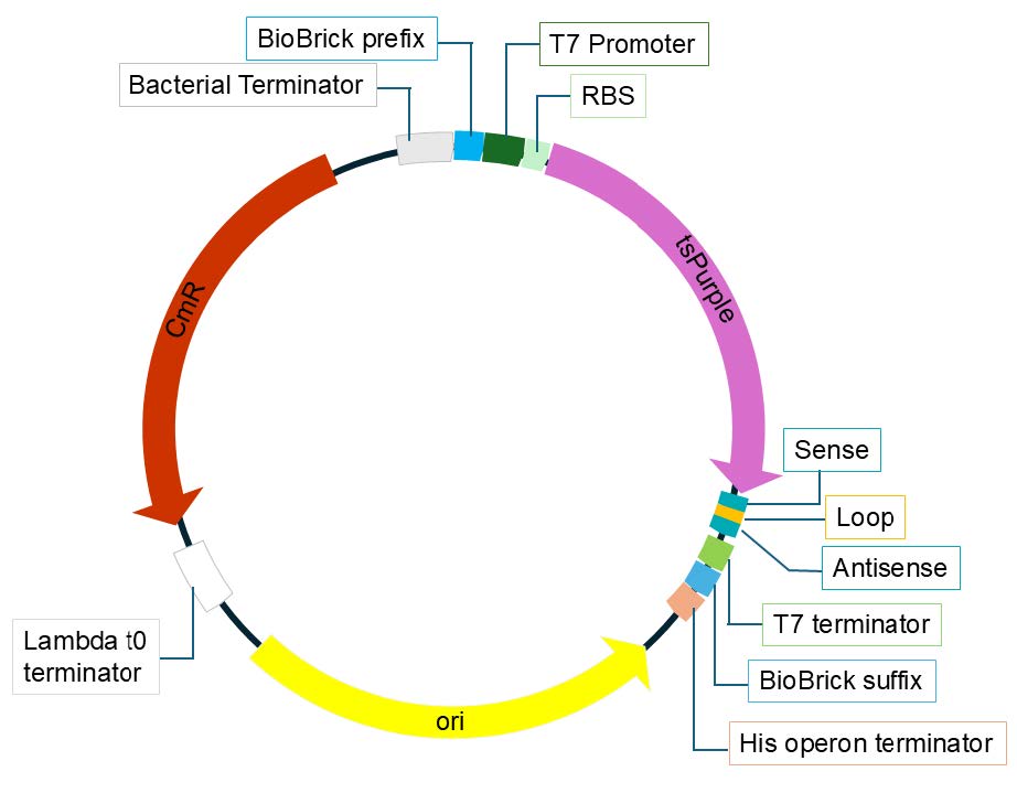 | Figure 3. Plasmid pPSLA design overview. The plasmid contains a T7 promoter, RBS, tsPurple coding sequence, and the sense, loop, and antisense sequences for siRNA production. |
