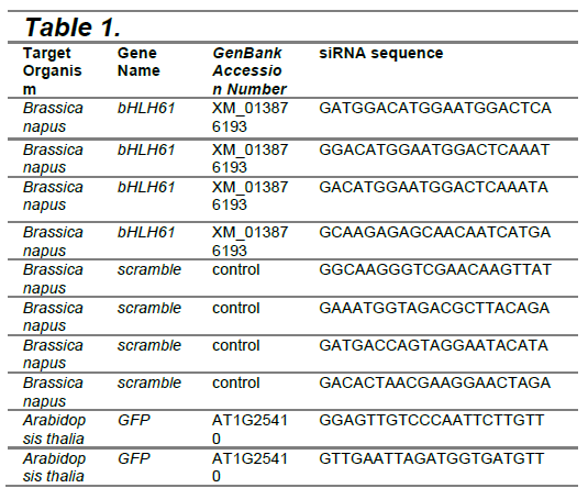 The Arabidopsis gene bHLH61 is a potential target for RNA interference. The Arabidopsis locus tag for this gene is AT5G10570 and encodes for a putative myo-inositol hexakisphosphate kinase (NIH, n.d.). A standard nucleotide BLAST was completed using the Arabidopsis gene sequence against Brassica napus, and a predicted transcription factor bHLH61 (LOC106435320) gene was found to share 86% identity. For siRNA design, Gen siRNA Wizard (https://www.invivogen.com/sirnawizard/siRNA.php) was used to generate potential siRNA candidate sequences. These sequences were manually checked for any off-target sequence overlap using BLAST. Four candidate siRNA sequences were chosen to target the bHLH61 gene in canola (Table 1). Scramble sequences were made from the candidate sequences and will be used as negative controls to ensure that any observed effects are due to specific gene silencing and not caused by non-specific siRNA activity or the transfection process itself. We aim to use Arabidopsis as a proof-of-concept; therefore, siRNAs will be designed for both canola and Arabidopsis gene sequences. Additionally, for our proof-of-concept testing, we will create an siRNA that will target GFP mRNA in transgenic Arabidopsis.