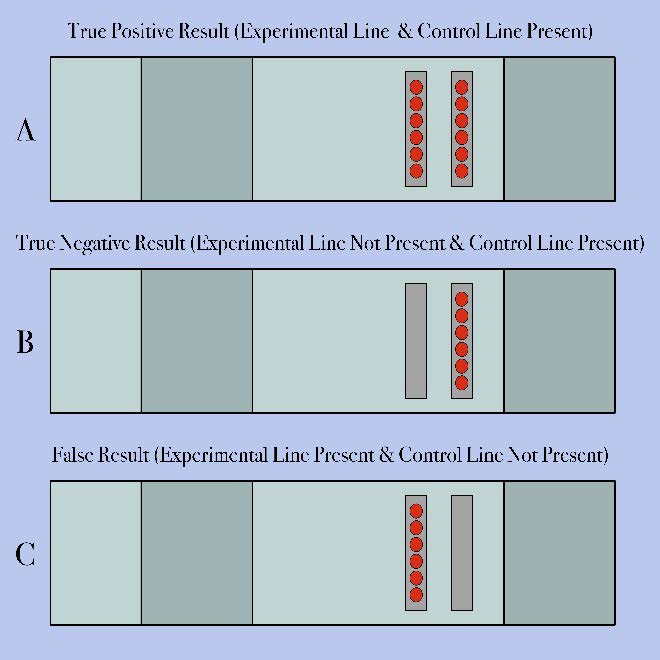 This diagram shows the mechanism by which the test works. Section A of the diagram depicts a TB-infected (therefore Ag85 containing) sputum sample initially contacting the sample pad. Section B of the diagram depicts the gold nanoparticle-EPR28401-54- antibody complexes binding to the Ag-85 antigens. Section C of the diagram depicts the antigen-antibody complex binding to the control and test line, indicating the individual has tuberculosis. The control line ensures functionality while the test line indicates the presence of Mycobacterium tuberculosis.