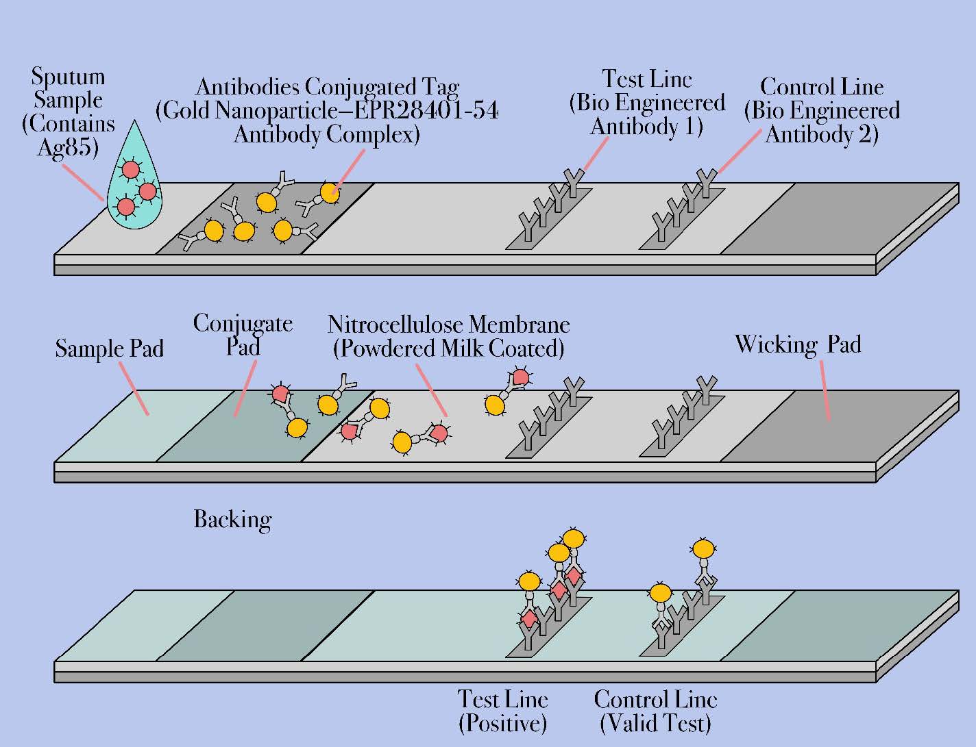 With this test, the goal was to detect the cell wall protein of M. tuberculosis, Ag85, as the antigen. This was achieved by designing a buffer that would lyse the M. tuberculosis bacteria so that the Ag85 antigen could be released for the antibody to bind to. The first antibody, EPR28401-54, would bind to gold nanoparticles and rest on a nitrocellulose membrane, which is porous and nonpolar to help facilitate capillary flow. Unsweetened milk powder was used as a surfactant for the nitrocellulose membrane to prevent protein complexes from binding to the membrane at undesired locations. As the antibody-gold complex traveled to the detection line, it would bind with another antibody, and the gold nanoparticles would be released. This then produces a color for visual identification. Through further research, interactions between the antibody, surfactants, blocking agents, and lysis buffer will be tested for more precise results. This test has the potential to affordably and efficiently reduce deaths caused by the pathogen through the rapid detection of M. tuberculosis to allow for further action to be taken immediately.