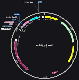 To test the efficacy of our bacterial transformation, we used E. coli K-12, which is a non-pathogenic strain. We designed a plasmid using SnapGene (Figure 1). For our plasmid design, we started with a pet28+ backbone with a Multiple Cloning Site, which had a built-in gene for kanamycin resistance to select for cells that were successfully transformed. Then, we used the BamHI and XhoI restriction sites to cut the plasmid and insert cvi and cvaC. Finally, our backbone contained an inducible T7 promoter that utilized IPTG for activation, allowing us to control when our genes were expressed.