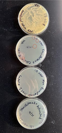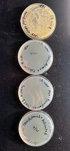 In the plate with LB and transformed E. coli, we expected a lawn as there was nothing to kill the E. coli; the colicin is not automatically produced when the plasmid is successfully integrated into the bacteria, it must be activated (by ITPG). We saw a lawn, as expected, meaning that our E. coli is viable and can survive after being transformed by our plasmid. On the plate with agar, Kanamycin, and transformed E. coli, we expected colonies with our transformed bacteria, which we had selected for by implementing an antibiotic resistance gene in our plasmid. We saw colonies, meaning our plasmid was successfully integrated into some of the bacteria, allowing the transformed E. coli to survive the Kanamycin.