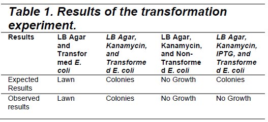 We used four groups for our experiment; we plated our transformed bacteria on a plate with just food (LB). This was to test if we had viable bacteria to survive the transformation. On a second plate, we plated LB, transformed bacteria, and an antibiotic (Kanamycin). The third plate was LB, Kanamycin, and non-transformed bacteria. Finally, we plated LB, Kanamycin, our transformed bacteria, and IPTG. The expected and observed results are summarized in Table 1 at the bottom of the results section.