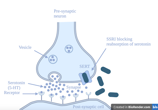 | Figure 1. Diagram of SSRI action at a synapse. SSRIs prevent reuptake of serotonin, which increases the amount present in the synapse and magnifies its effects. Created in https://BioRender.com. |