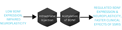 With 210 million people diagnosed with major depressive disorder (MDD) worldwide, antidepressants, particularly selective serotonin reuptake inhibitors (SSRIs), are widely used. SSRIs stop or delay the body from reabsorbing serotonin, leaving more of it available for the body to use. This regulates mood, but patients don’t see results for up to six weeks. However research found that depression is the failure of neuroplasticity (the brain’s ability to change and adapt), and that SSRIs work partly due to their ability to boost this. Studies found that synaptic density and plasticity were improved with prolonged use of SSRIs. However, this improvement often takes weeks, likely explaining the delay in mood enhancement. SSRIs enhance brain-derived neurotrophic factor (BDNF) gene expression, which encodes the BDNF protein. BDNF regulates synapse functions through its TrkB receptors. The BDNF-TrkB pathway is key in supporting neuroplasticity. The objective of this research is to enhance BDNF expression, and therefore accelerate neuroplasticity which will allow patients to experience the effects of SSRI treatment faster. Epigenetic changes are observed in depressed patients; methyl groups attach to BDNF histones, inhibiting the gene expression, and there are not enough acetyl groups on its promoters to counteract this. The method of increasing BDNF transcription is through administering autologous mesenchymal stem cells (MSCs) that contain BDNF protein in secretory vesicles via intrastriatal injection. These MSCs deliver BDNF protein to neurons, promoting the activation of the BDNF-TrkB pathway and ultimately improving neuroplasticity. Activating the transcription factor cAMP-response element binding protein (CREB) induces BDNF expression by increasing acetylation. With the increase of BDNF expression, it is expected that neuroplasticity will improve. Complemented with SSRIs, the improvements in neuroplasticity would hopefully decrease the time it takes to relieve depression symptoms. However, this research is not limited to only complementing SSRIs. Theoretically, just by improving neuroplasticity patients’ MDD will be improved. The possible applications of enhancing BDNF can be applied to other ongoing research and can spark new medications regarding the treatment of MDD.