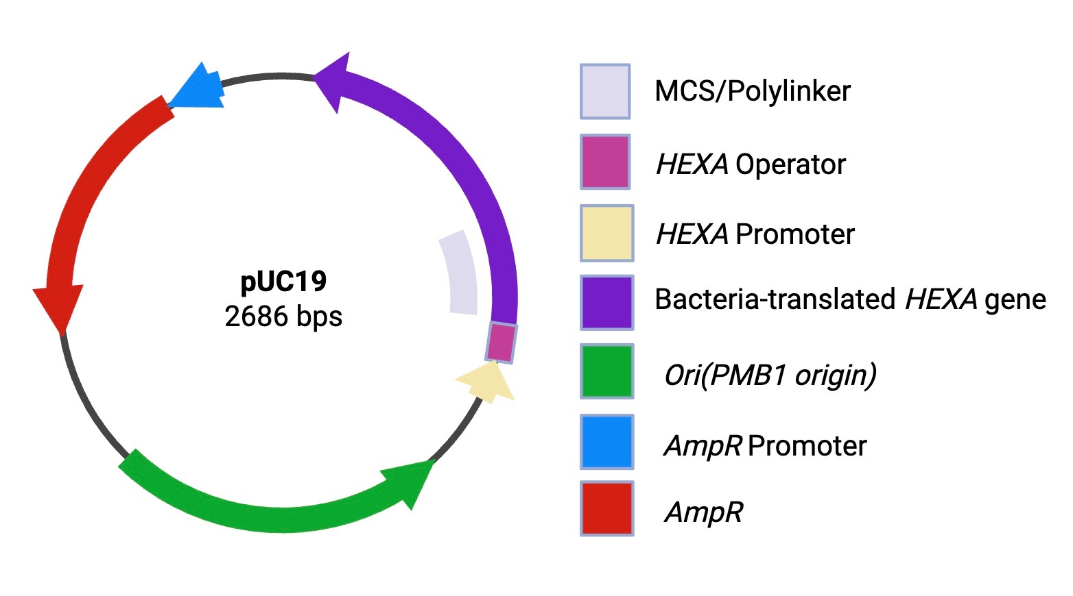 For experimentation, we plan on inserting the HEXA gene into the pUC19 plasmid in place of the LacZ gene. pUC19 was chosen due to its high copy number and its cloning ease. To ensure compatibility with the chosen E.coli plasmid, we will remove the introns to bacterially translate the human HEXA gene. Although E. coli cannot perform post-translational modification, this limitation is acceptable at this stage of the project as the current focus is on the transcriptional activity rather than the protein activity. Once the introns are spliced out, the new exon chain can be inserted into pUC19, where it will then rapidly replicate under optimal conditions (40°C in LB medium with antibiotics) (J.F. & Russell, 2001) ). We will then test the plasmid’s effectiveness using an SDS-PAGE gel, the most optimal form of gel electrophoresis for protein separation and identification, as well as a western blot to ensure thepresence of HEXA. Once the presence of HEXA is confirmed, the protein will be extracted and placed in a glycerol-phenol solution to preserve it and to stabilize it against any temperature strain.